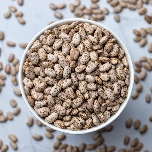 Medium-sized, oval-shaped bean with a mottled beige and brown skin, an earthy flavor and a powdery texture. Closely related to red kidney beans. When cooked, pintos lose their mottling and turn brown. Most often used in refried beans and are great for Tex-Mex and Mexican bean dishes, pot beans, soups and casseroles.