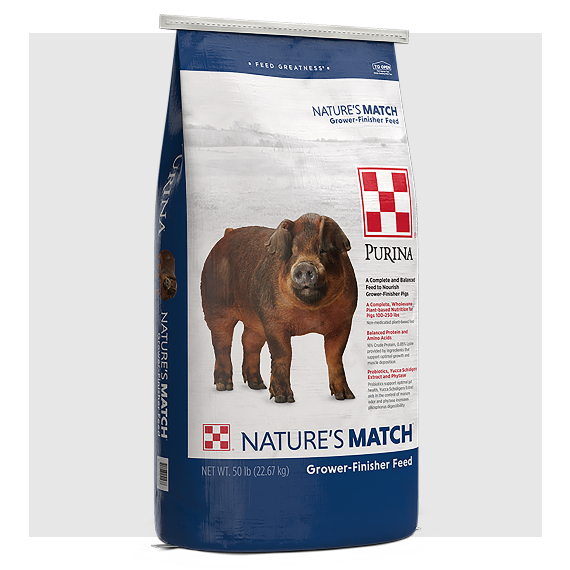 Purina Nature’s Match® Grower-Finisher is a complete, all-natural feed for growing-finishing pigs weighing between 100 and 250 pounds. This 16% protein product is formulated to provide a balanced diet to support optimal performance in any style of pig management. Your pigs can transition easily onto this product from Nature’s Match® Starter-Grower.